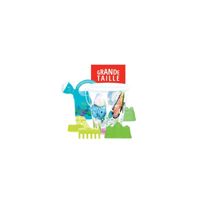 Seau transparent décoré, de 22 cm de diamètre, et divers accessoires (arrosoir, râteau, pelle, moules à chateau de sable).