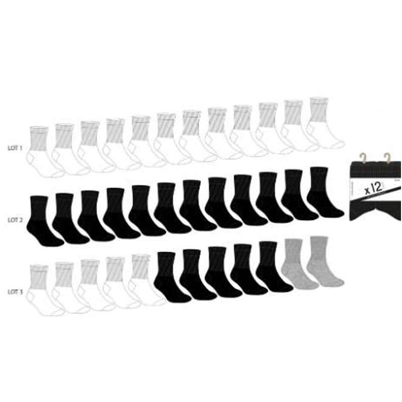 12 paires de soquettes homme 40/46, couleur unie (blanc x 12, noir x 12 ou 5 blanc, 5 noir et 2 gris)