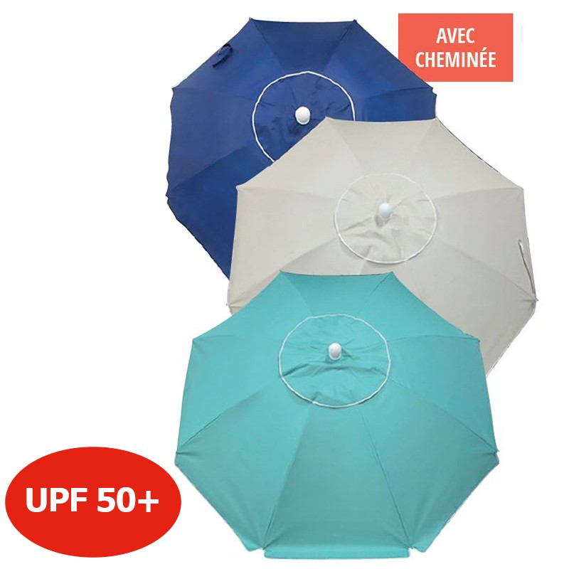 Parasol anti UV en polyester, avec une cheminée qui permet de laisser passer l'air. Ainsi le parasol ne s'envole pas.