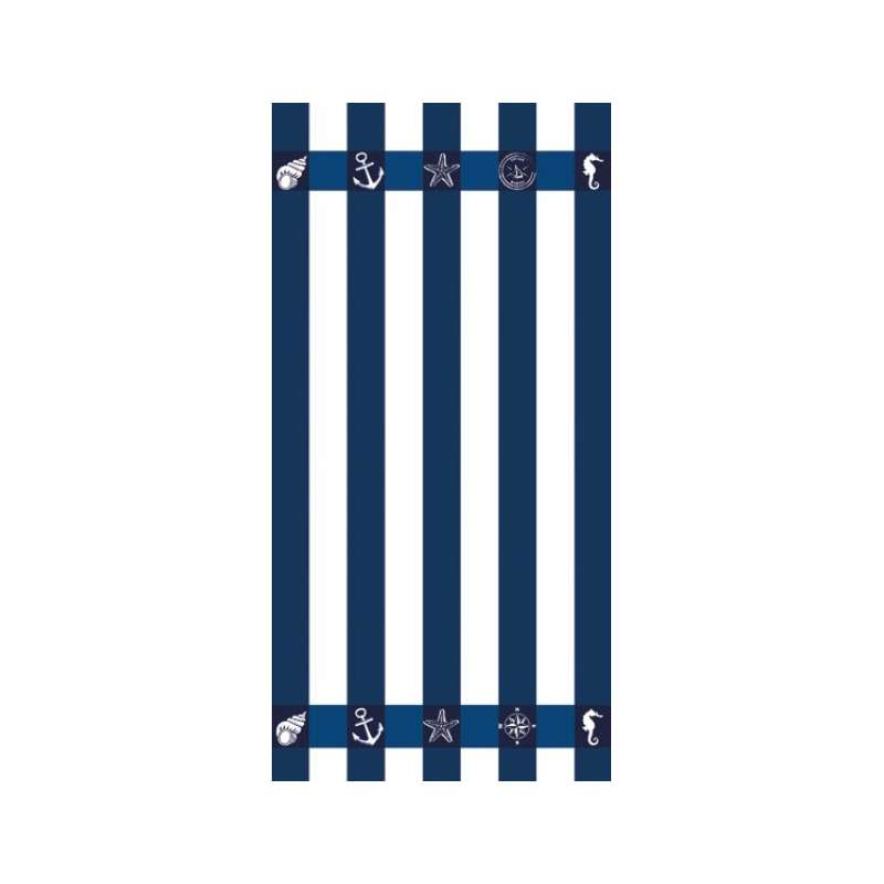 Serviette de plage en microfibre, avec motif rayé et symboles marins.